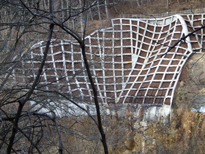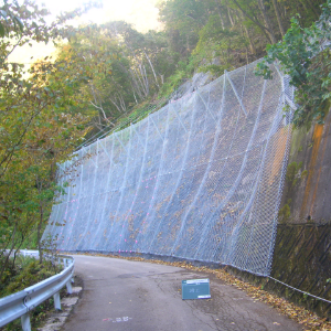 比較的規模の小さい落石が発生する法面や転石混じりの岩盤を、網とワイヤーを用い、覆うことで落石の発生を保護したり、落石が発生した場合でも道路上に石が跳躍しないよう、保護する工法です。